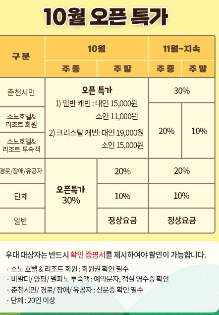 10월 오픈특가는 춘천시민, 소노호텔&리조트 회원, 소노호텔&리조트 투숙객에 대해서는 10월에는 주중/주말 상관 없이 일반캐빈은 대인 15,000원, 소인 11,000원에 이용가능하며, 크리스탈캐빈 (바닥이 유리로 되어 있는 특수 캐빈)은 대인 19,000원, 소인 15,000원입니다.